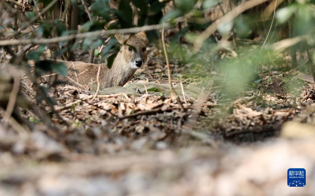 3月3日,一头獐在松江叶榭獐极小种群恢复与野放基地树林中休憩。