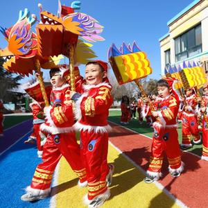 3月3日,山东省青岛市即墨区龙山中心幼儿园的孩子们在进行舞龙表演。