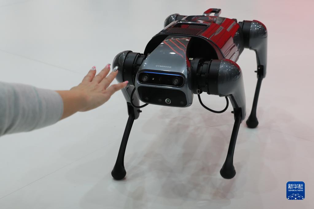 3月3日,一名女子在西班牙巴塞罗那2022世界移动通信大会的小米公司展区与CyberDog仿生四足机器人互动。