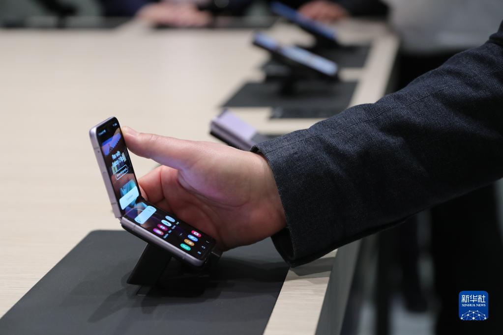 3月3日,参观者在西班牙巴塞罗那2022世界移动通信大会的三星公司展区体验Galaxy Z Flip3手机。