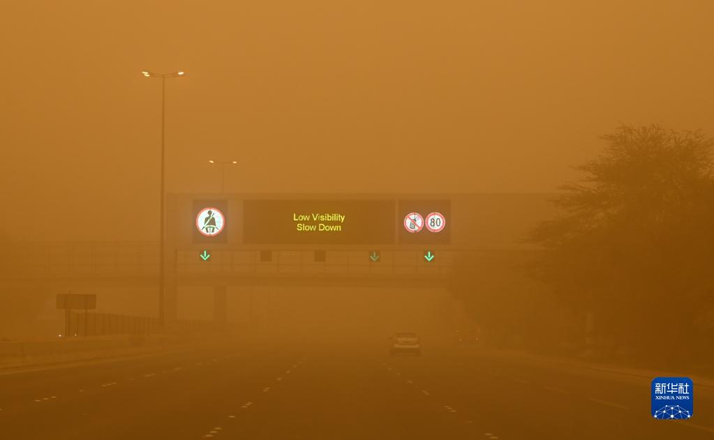 3月4日,在科威特首都科威特城,汽车行驶在沙尘中。