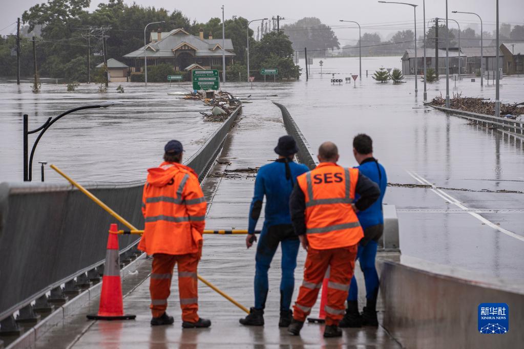 3月4日,在澳大利亚新南威尔士州里士满,救援人员在被洪水淹没的区域附近观察。
