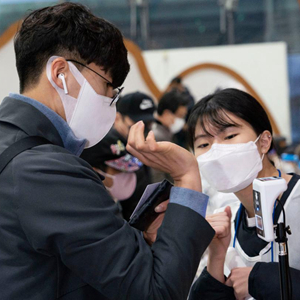 3月4日,在韩国首尔一个投票站,选民投票前接受体温检测。
