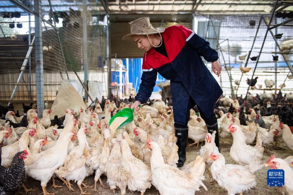 2月22日,在湖南省益阳市沅江市胭脂湖街道南竹山村,蒋连超在喂鸡。