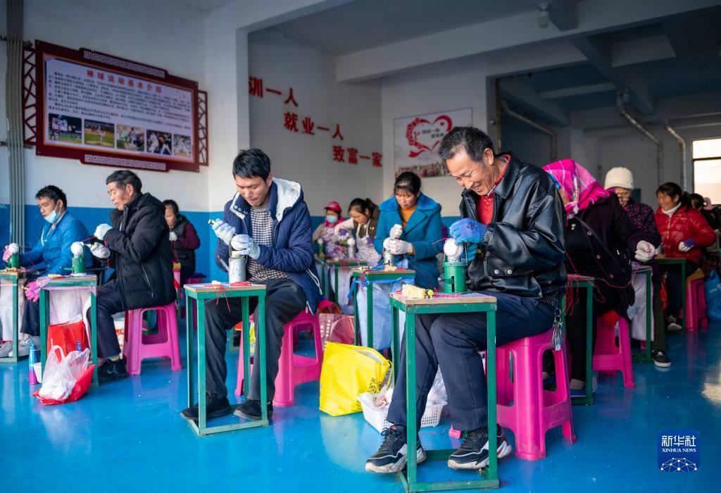 3月4日,脱贫群众在云南省曲靖市会泽县城搬迁安置点一棒球车间缝制棒球。