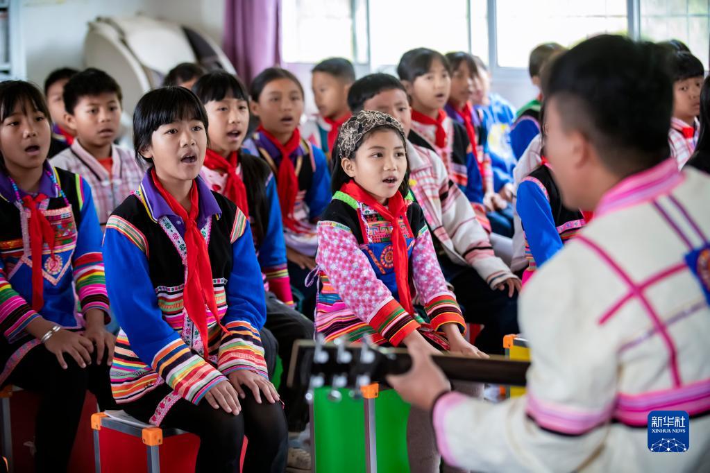 学生在云南省西双版纳傣族自治州景洪市基诺山基诺族乡民族小学音乐课上唱歌(2021年12月13日摄)。