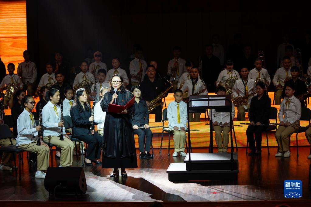 图为在重庆市特殊教育中心《我们的国家》主题音乐党课上,校长李龙梅与扬帆管乐团的学生们一同表演(2021年5月15日摄)。