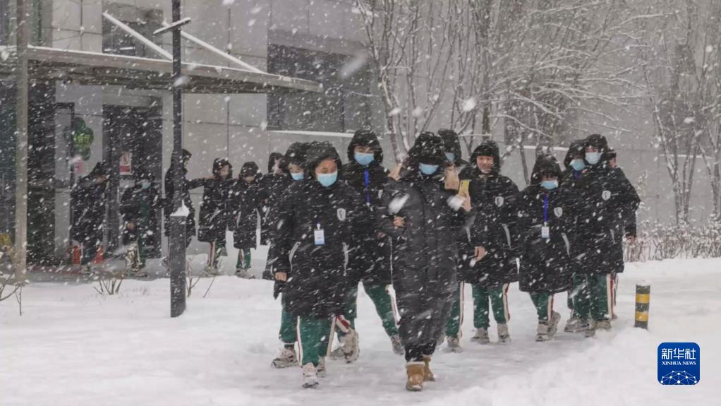 图为重庆市特殊教育中心扬帆管乐团参演团队在北京冒雪前往排练场馆(2月13日摄)。