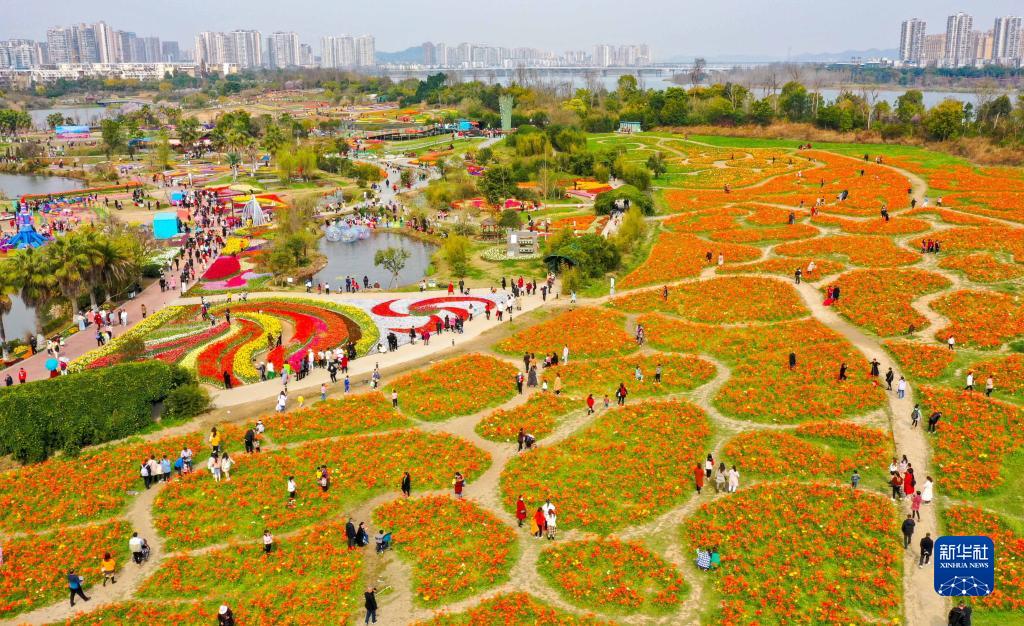 3月6日,四川省遂宁市圣莲花开景区的鲜花开放,吸引游客前来踏青赏花(无人机照片)。