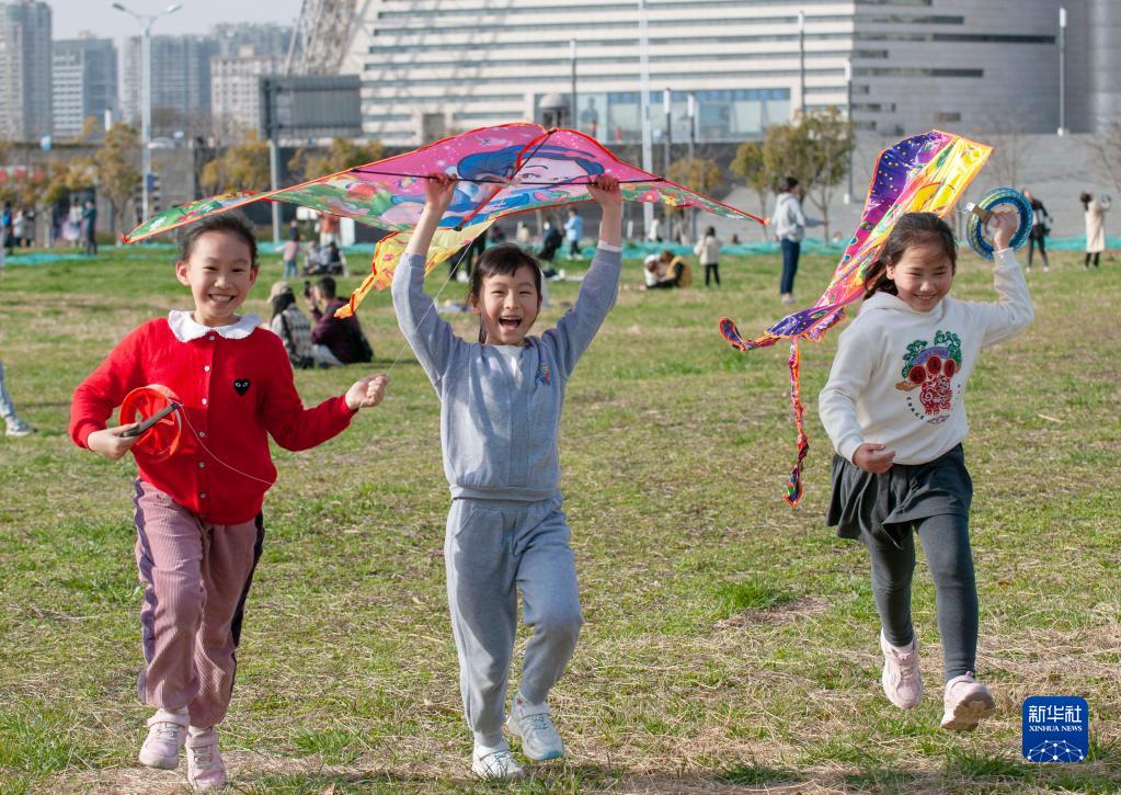 3月6日,小朋友在江苏无锡蠡湖畔放风筝。