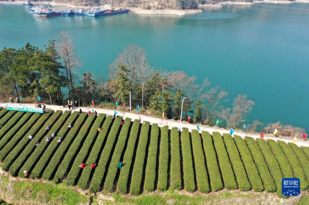 3月4日,人们在湖北省宜昌市夷陵区太平溪镇韩家湾村的茶园采茶(无人机照片)。