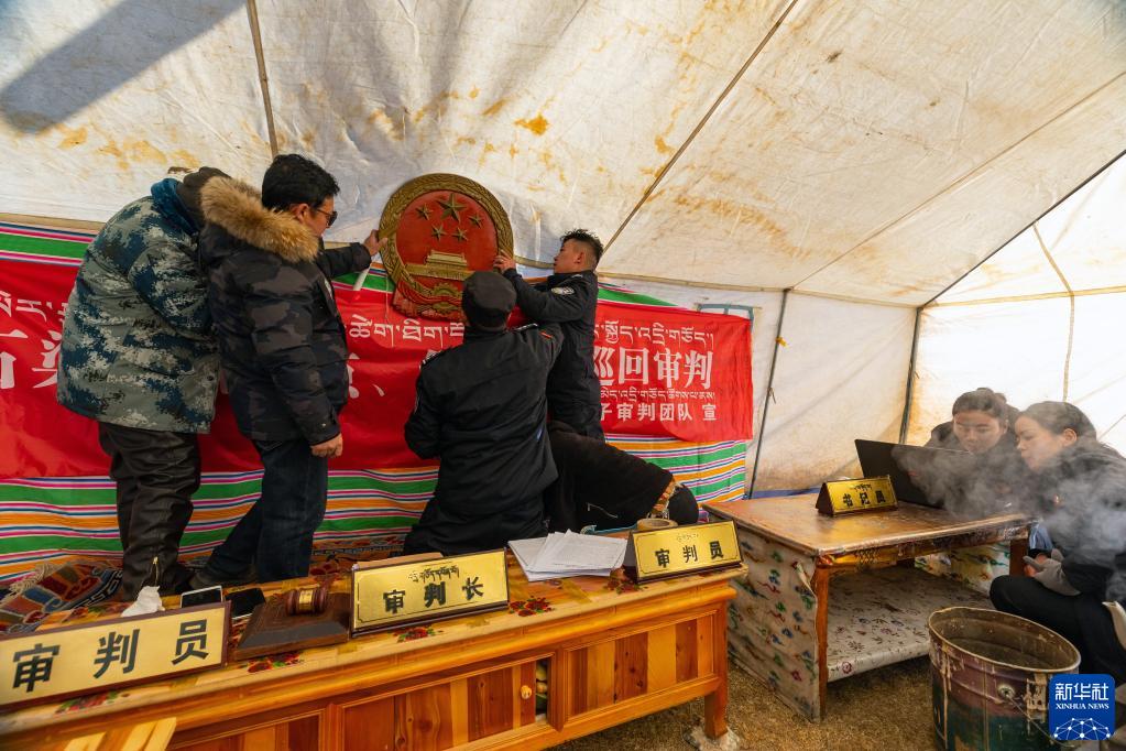 “正义雪莲”女子审判团队成员乘车来到距离石渠县城70公里的呷依乡,准备通过巡回审判开庭审理一起离婚案。这是工作人员在当事人家的一顶帐篷中布置“帐篷法庭”(1月10日摄)。