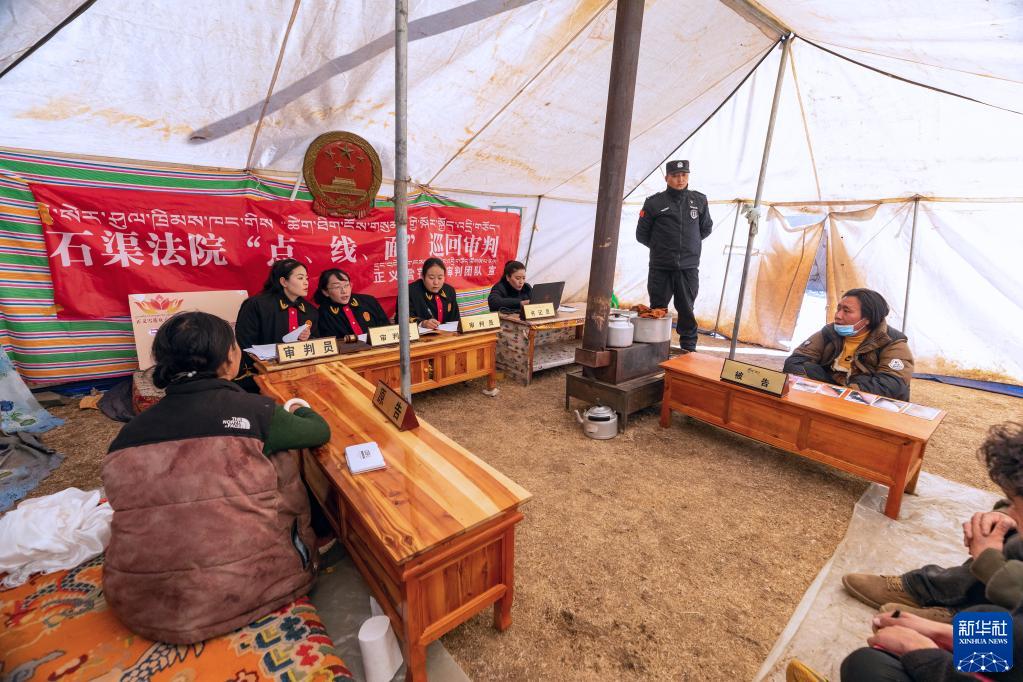 “正义雪莲”女子审判团队成员乘车来到距离石渠县城70公里的呷依乡,在一顶帐篷布置成的“帐篷法庭”里,通过巡回审判开庭审理一起离婚案(1月10日摄)。