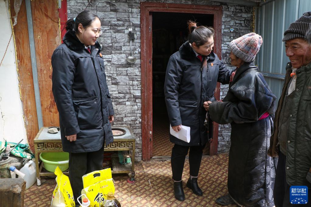 “正义雪莲”女子审判团队成员到当事人家中回访,并为其送来米、油等生活用品(2021年4月14日摄)。