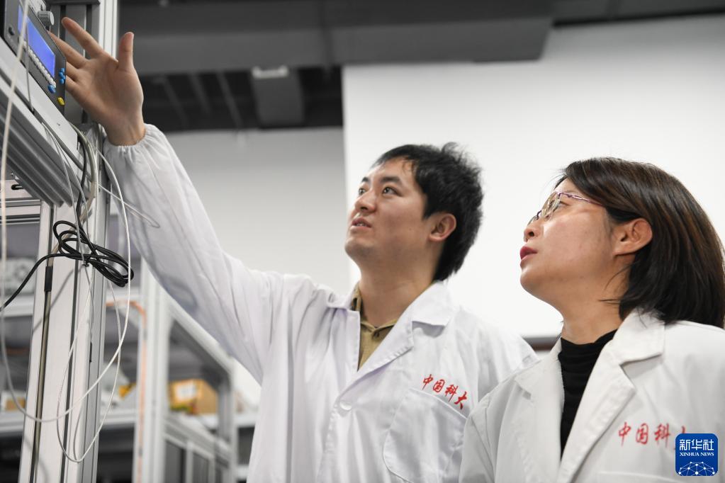 3月6日,在中国科学技术大学内,彭新华教授(右)与团队成员在中国科学院微观磁共振重点实验室内交流。