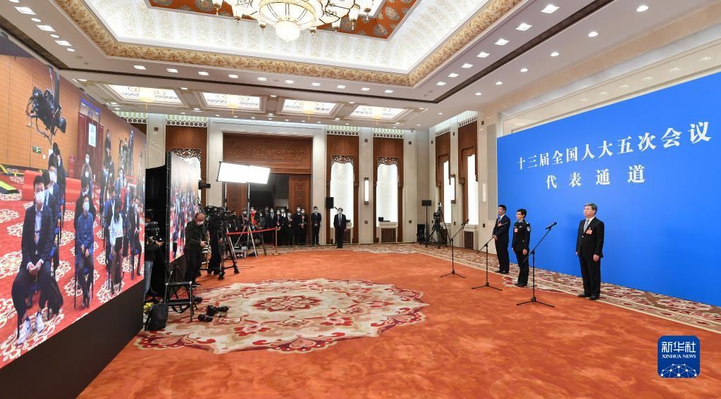 3月8日,第十三届全国人民代表大会第五次会议举行第二场“代表通道”采访活动。这是全国人大代表陆文俊、杨蓉、葛明华(从右至左)通过网络视频方式接受采访。
