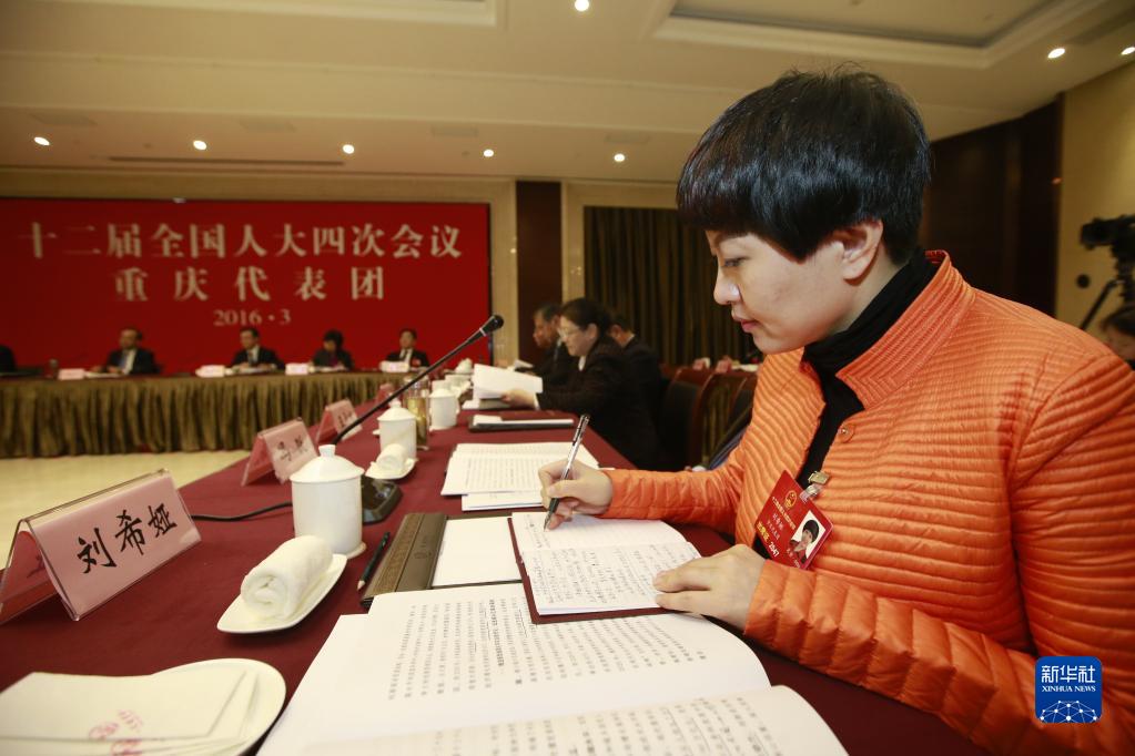 2016年全国两会期间,刘希娅(右一)在重庆代表团分组讨论中做记录(2016年3月5日摄)。