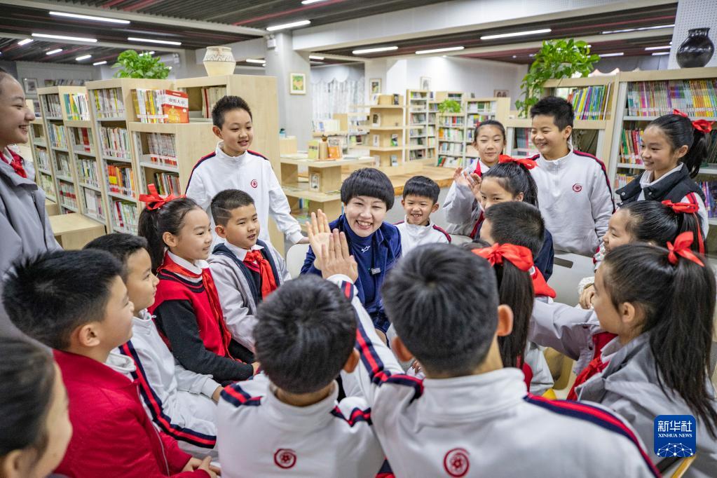 2月24日,在重庆市九龙坡区谢家湾学校,刘希娅(中)与学生们聊天之前击掌迎接新学期的到来。