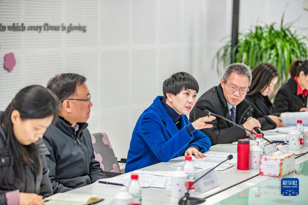 2月24日,在重庆市九龙坡区谢家湾学校,刘希娅(左三)与集团校部分教师代表、教育主管部门代表以及其他学校代表交流,收集大家对“双减”政策在落地执行中的意见和建议。