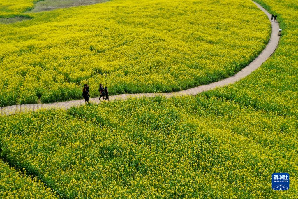 3月8日,游客在重庆市大足区中央城市花海公园的油菜花田里游玩(无人机照片)。