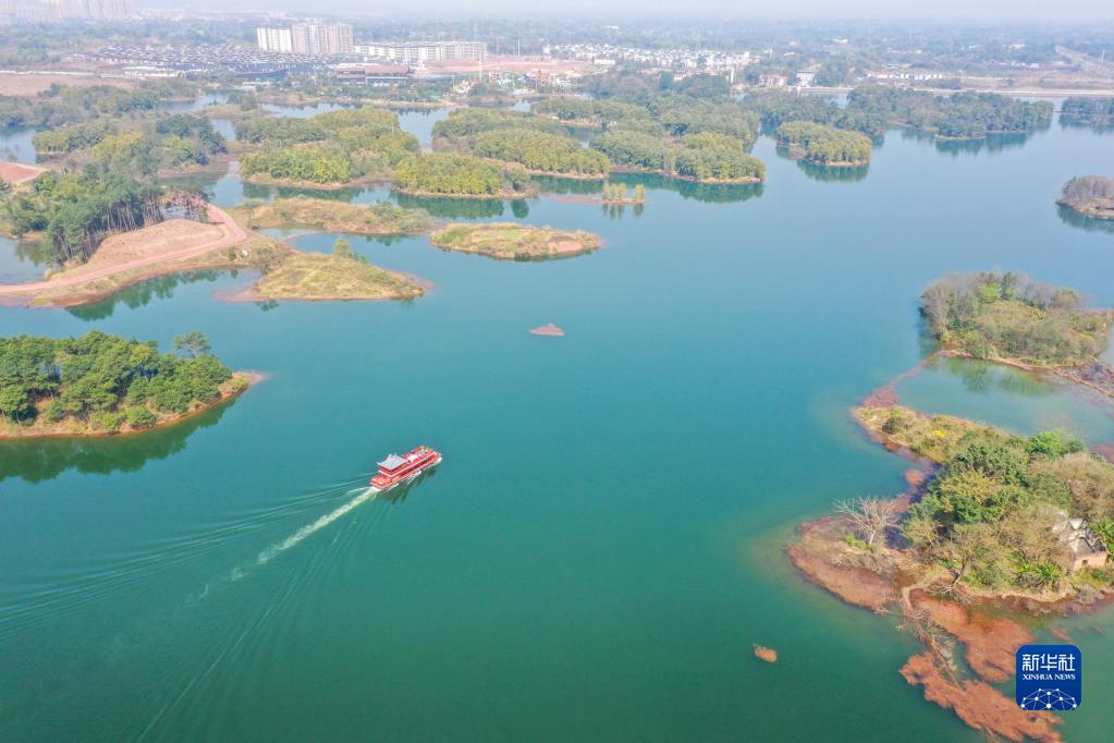 3月8日,在重庆市大足区双龙湖景区,一艘游船泛舟湖上(无人机照片)。