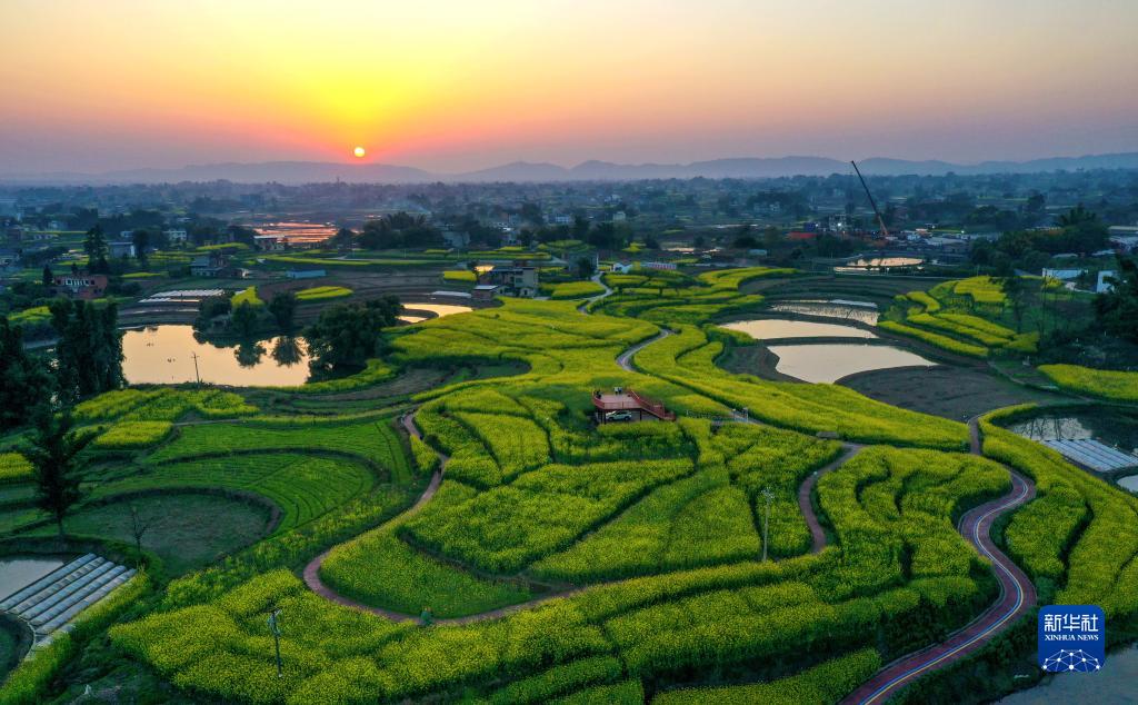 3月7日,四川省泸州市泸县方洞镇陈田村的油菜花迎春绽放(无人机照片)。
