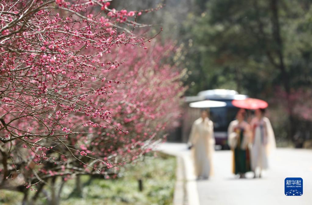 3月8日,游人在湖南省张家界景区黄石寨梅园游玩。