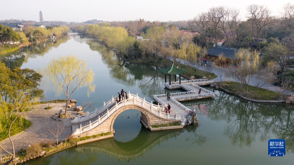 3月8日,游客在江苏扬州瘦西湖风景区踏春游湖(无人机照片)。
