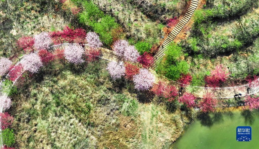 3月8日,人们在湖南省衡阳市常宁市罗桥镇庙山村樱花园踏青赏花,乐享春光(无人机照片)。