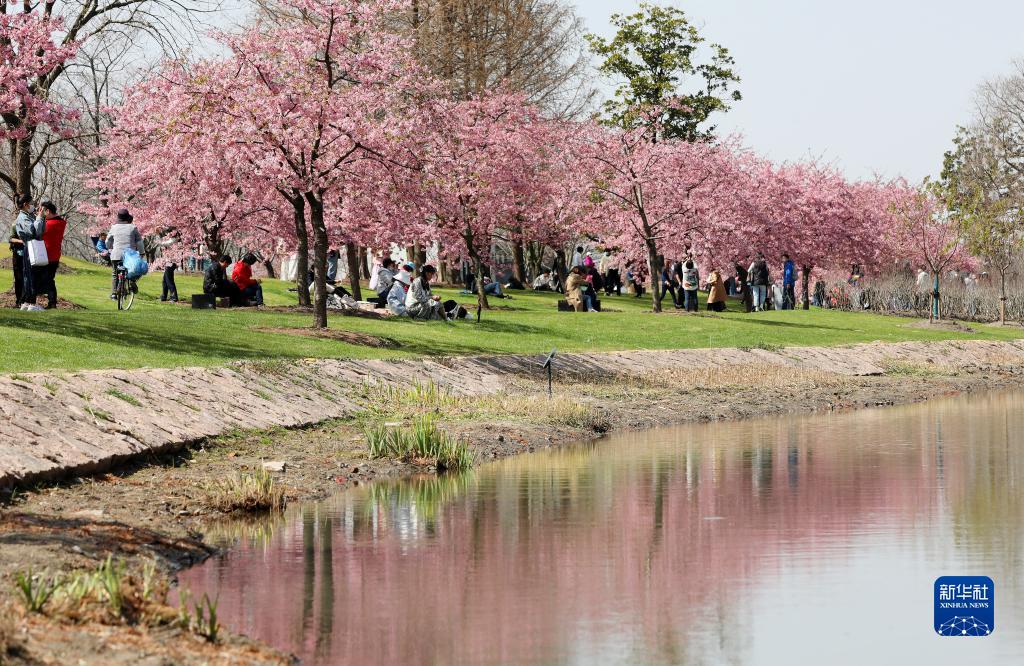 3月8日,游人在上海辰山植物园盛开的樱花树下休闲散步。