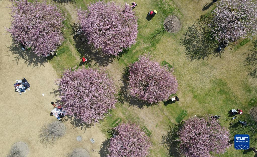 3月8日,游人在上海辰山植物园盛开的樱花树下休闲散步(无人机照片)。