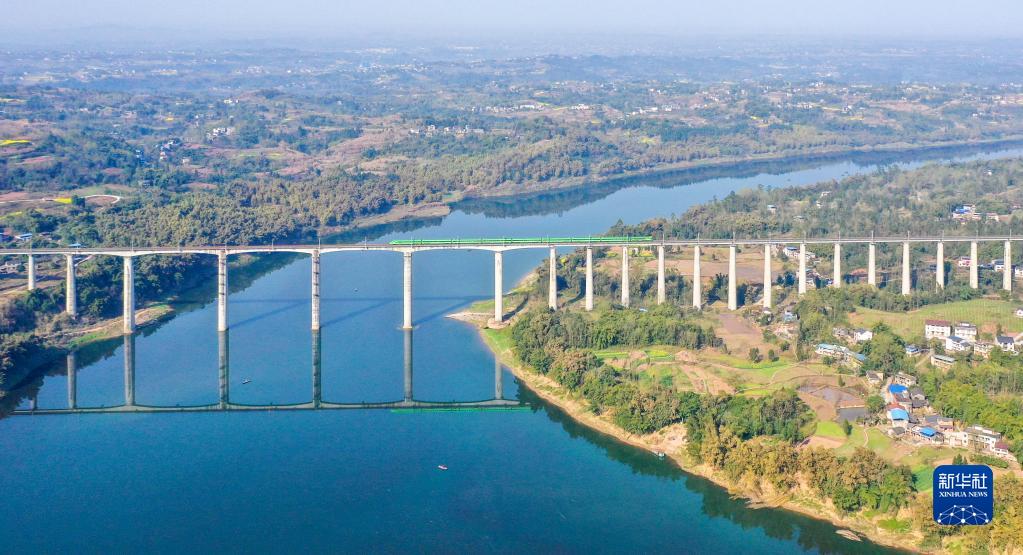 3月8日,在四川省广安市华蓥市明月镇境内,动车行驶在兰渝铁路南高支线上(无人机照片)。