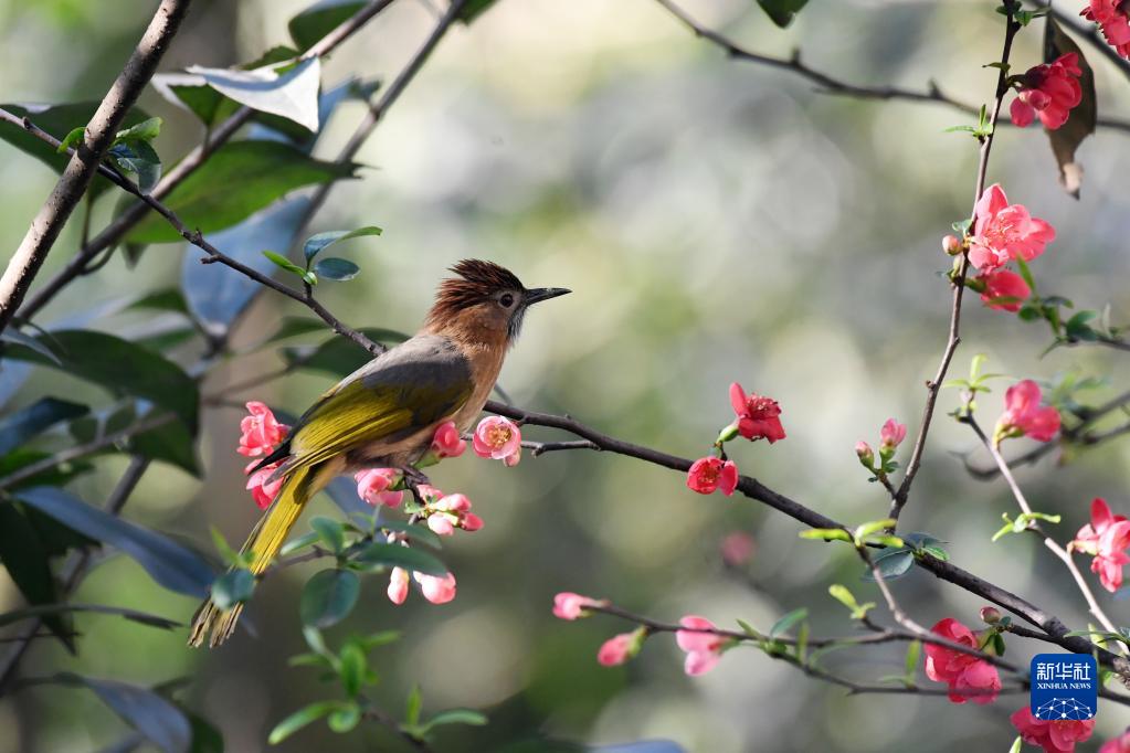 3月8日,在贵州省仁怀市盐津街道馨天地小区,一只小鸟在贴梗海棠枝头驻足。