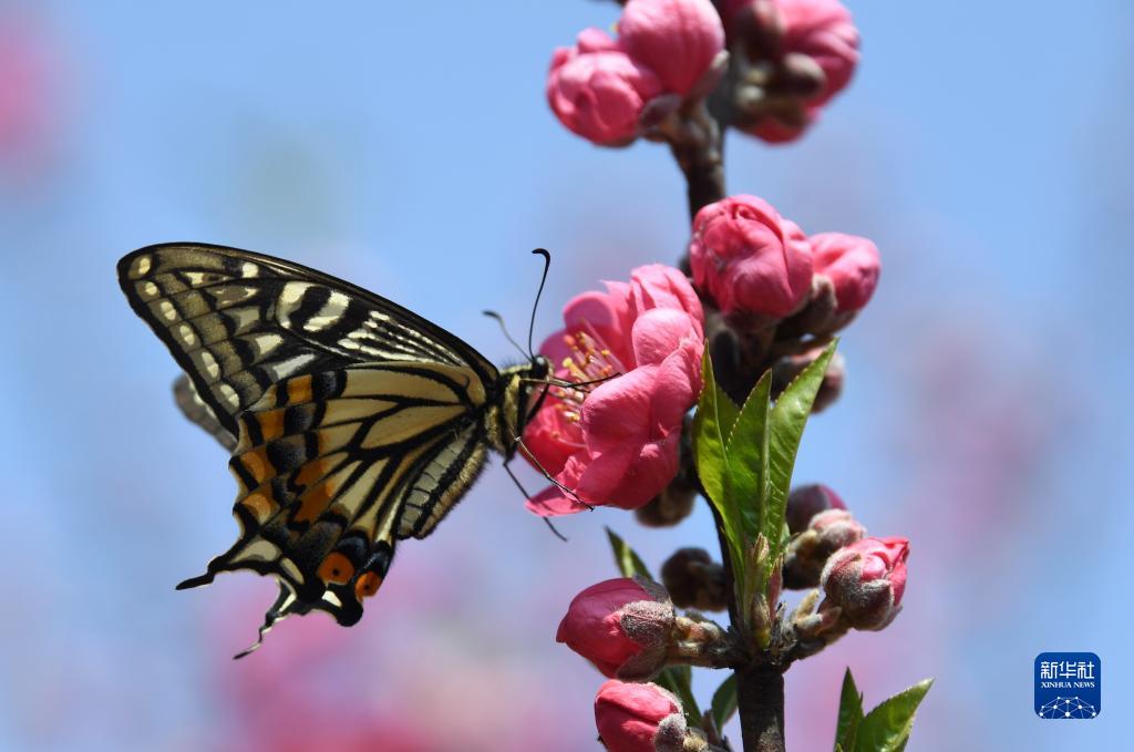3月8日,在广西河池市罗城仫佬族自治县天河镇彩虹谷桃花园里拍摄的蝶恋花。