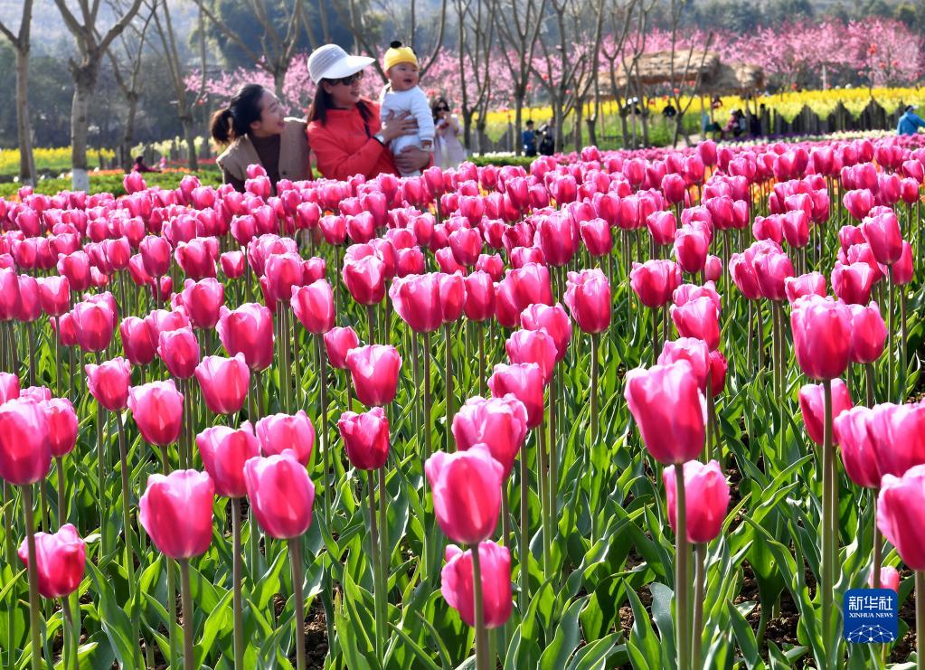3月8日,游客在四川省广安市岳池县银城花海观赏郁金香。