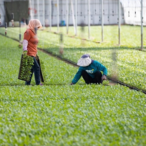 3月8日,农民在宁夏贺兰县隆源村的蔬菜种植园区育苗棚内劳作。