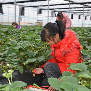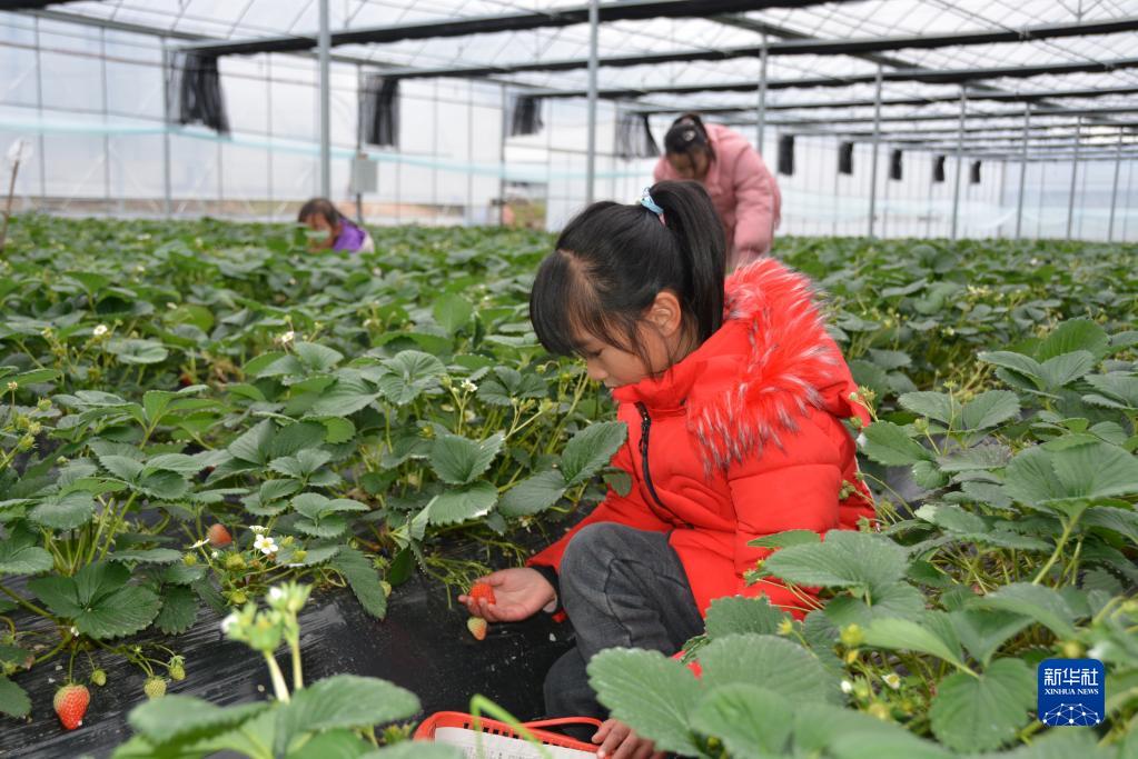 2月9日,小朋友在福建省南平市建阳区麻沙镇水南村村民刘贵道的采摘园内采摘草莓。