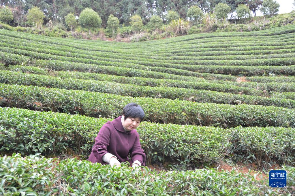 2月10日,福建省南平武夷山市兴田镇西郊村村民游瑞娇在茶山上查看茶叶长势。
