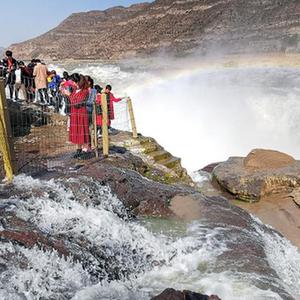 随着气温不断回升,黄河壶口瀑布水流量明显增大,在阳光的照射下,飞瀑与彩虹相映成趣,把一幅动静结合的春天画卷展现在游客眼前。