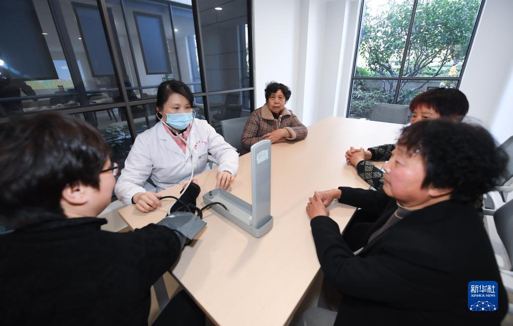 3月8日,在诸暨市暨阳街道祥生府小区文化驿站内,医务人员给居民做健康检查。