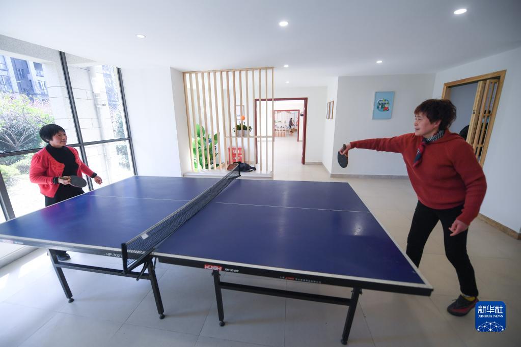 3月8日,居民在诸暨市暨阳街道祥生府小区文化驿站内打乒乓球。
