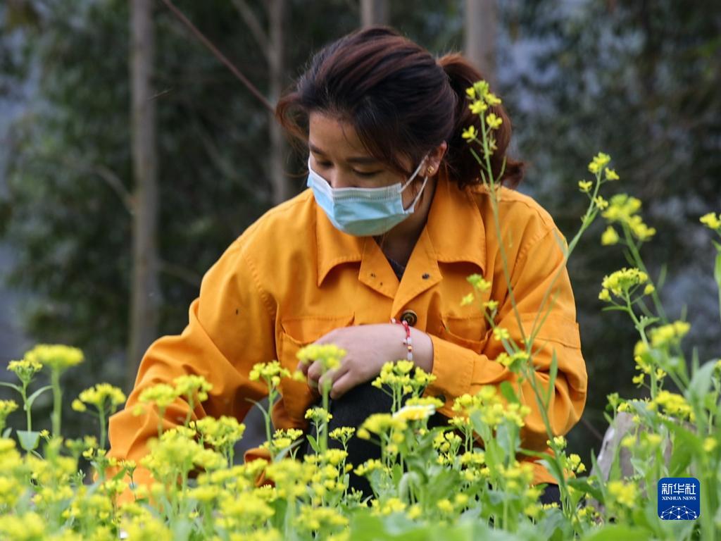 3月7日,在百色车务段八渡站,一名布依族厨娘在小菜园里摘取菜心为火车司机准备晚饭。
