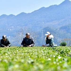 春暖茶山,春茶萌芽,茶农们采摘茶叶嫩芽,供应市场。