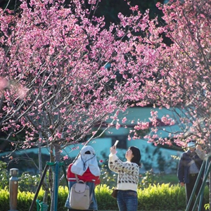 近日,澳门氹仔龙环葡韵的樱花盛开,春意盎然。