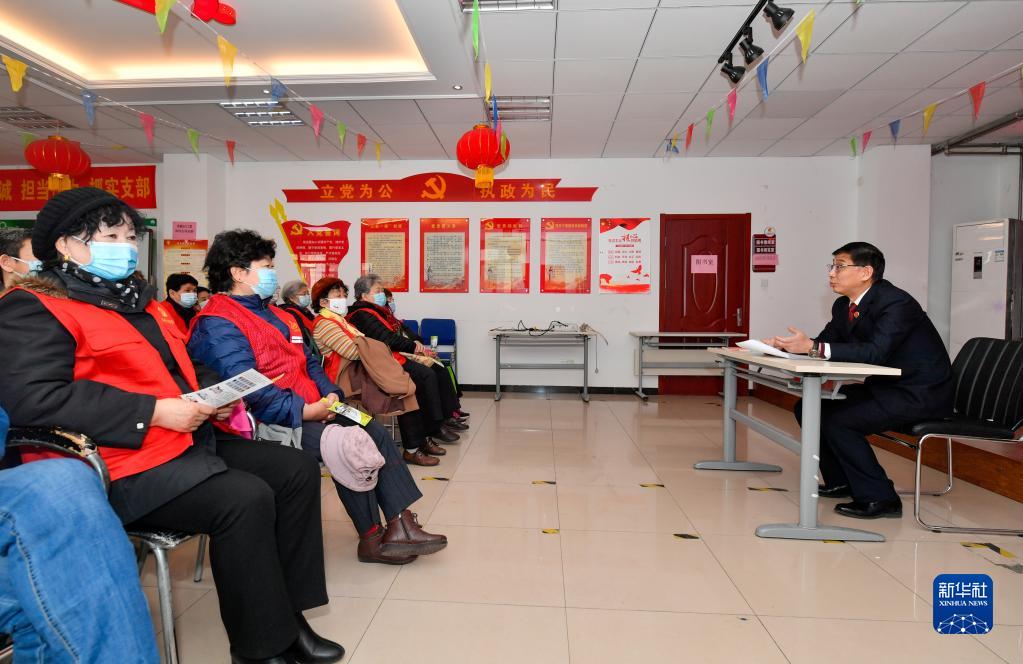 3月8日,在天津市南开区向阳路街道大园新居社区居委会,天津市南开区人民检察院检察官刁智(右)向居民宣讲《中华人民共和国反有组织犯罪法》。