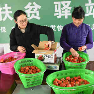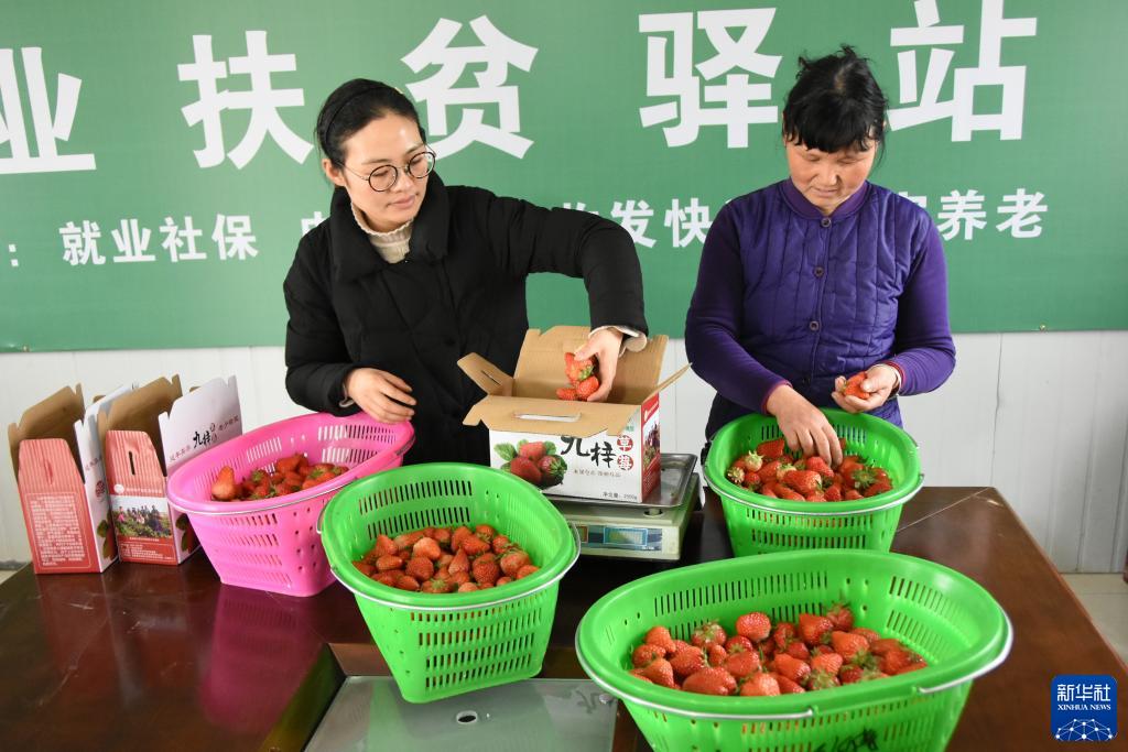 王萌萌(左)和村民一起分装刚采摘的草莓(2018年2月27日摄)。