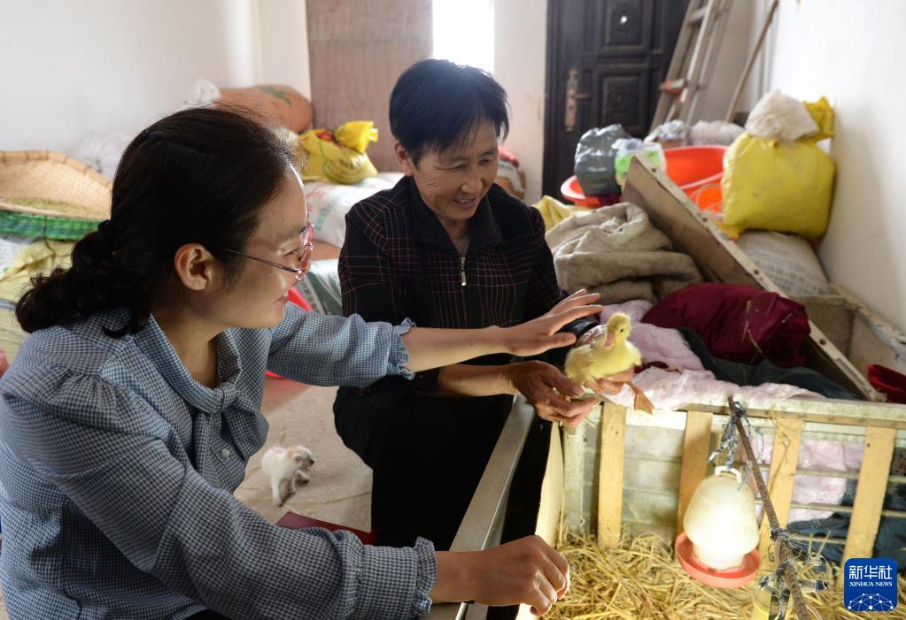 王萌萌(左)在定远县西孔村的农户家中走访(2020年5月8日摄)。