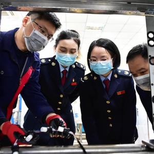3月9日,在福夏科技有限责任公司生产线上,福州经济技术开发区税务局工作人员(左二、左三)在了解企业生产状况。