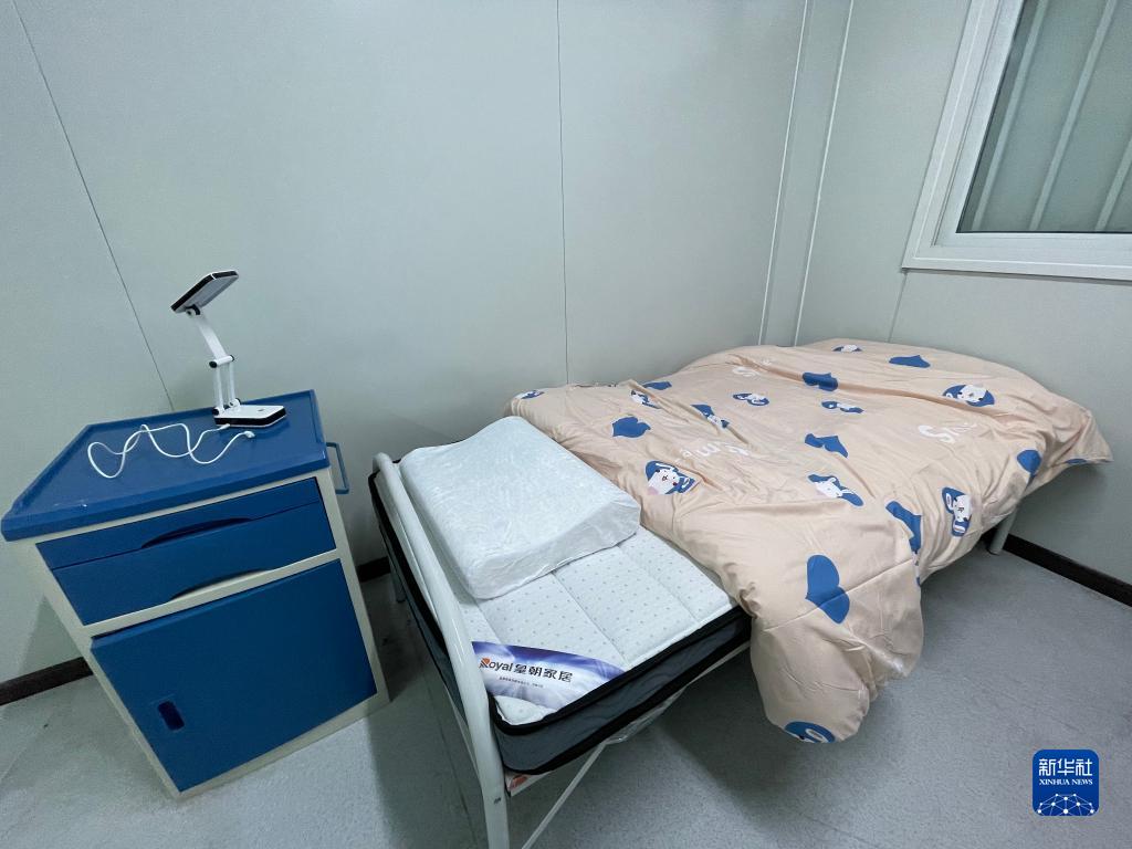 这是3月9日拍摄的方舱医院房间(手机照片)。每位入住者配有一床薄羽绒被及被罩、一个乳胶枕头及枕套、一个床头柜及充电式折叠小台灯。