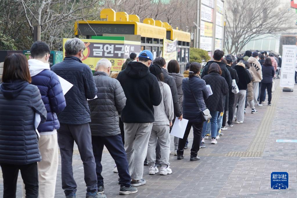 3月9日,人们在韩国首尔一处新冠检测点排队等待检测。